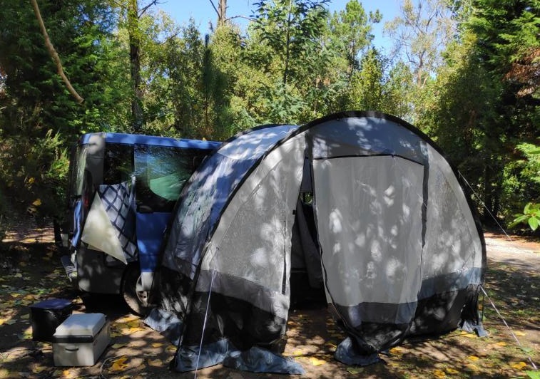 Ein blauer Van, davor eine Wäscheleine mit Wetsuit und Handtüchern. Ein blauer Rucksack und ein Surfboard liegen auf dem Boden